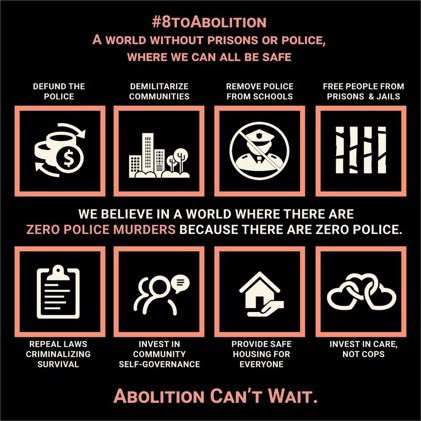 I am learning by reading the commitments of 8 to Abolition and following their hashtag #8toAbolition. They are committed to a world without policing, to “a world without police, where no one is held in a cage, and all people thrive and be well” and have eight policy changes to get us there.